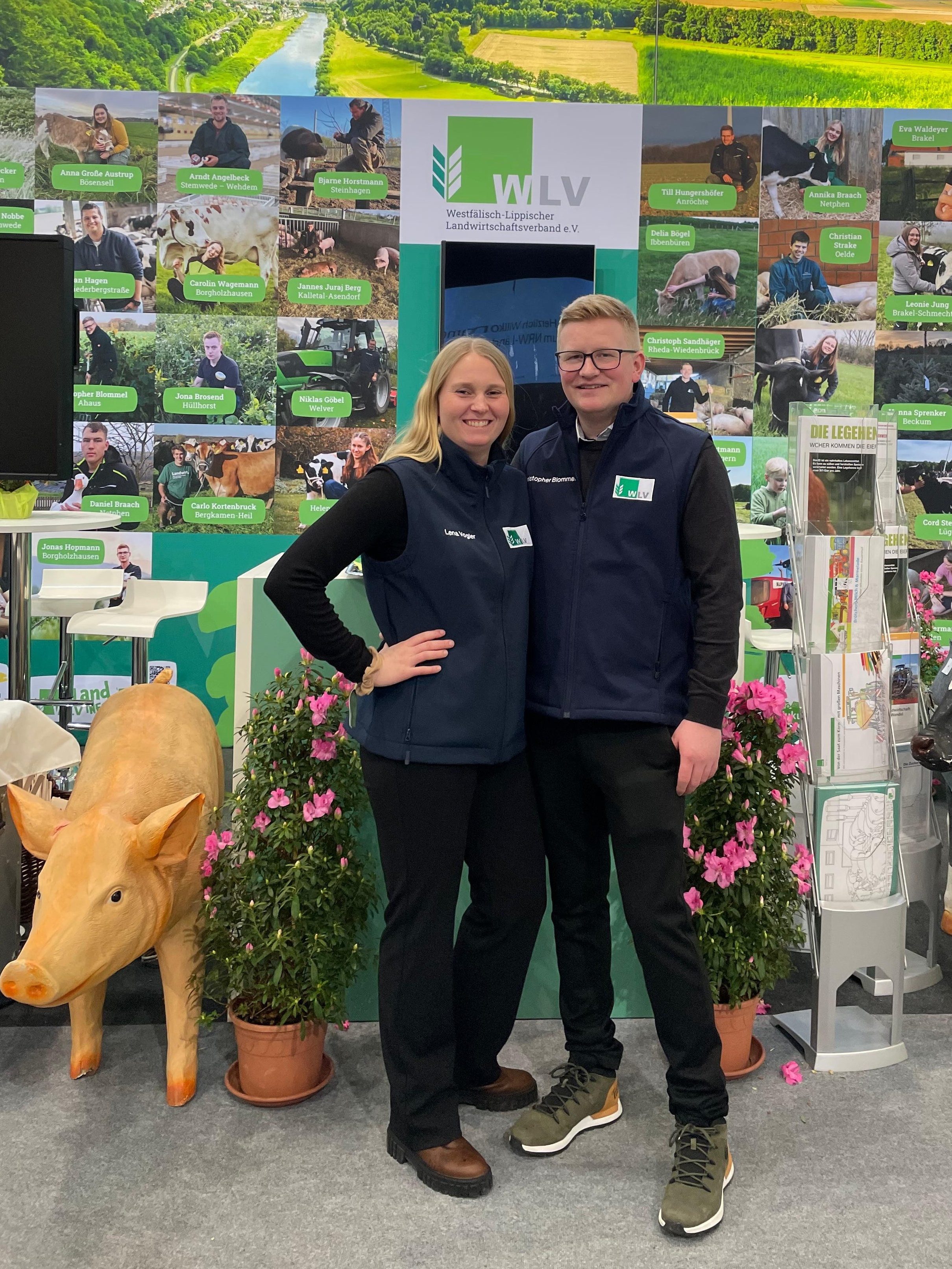 Vogler und Blommel sind am WLV-Stand Teil eines Teams aus mehr als 30 jungen Landwirten und Landwirtinnen aus ganz Westfalen-Lippe, die unter dem Motto „Mit Begeisterung und Verantwortung in die Zukunft – für eine nachhaltige Landwirtschaft“ den Messebesuchern der Grünen Woche die Landwirtschaft näherbringen wollen.