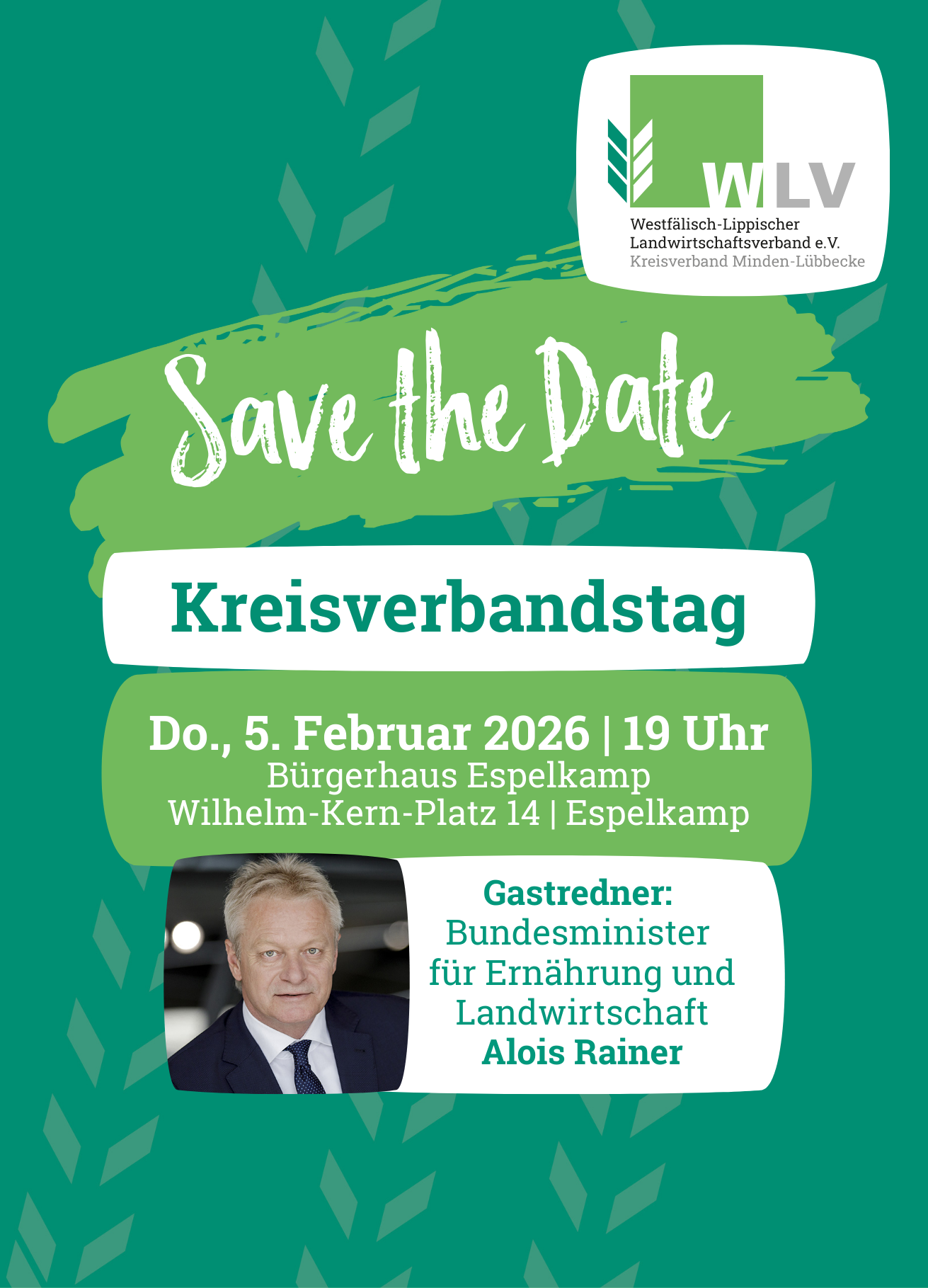 Prominenter Gast des Kreisverbandstages am Dienstag, 5.02.2026 ist Bundeslandwirtschaftsminister Alois Rainer. Der Bauerntag des Landwirtschaftlichen Kreisverbandes Minden-Lübbecke findet im Bürgerhaus Espelkamp, um 19.00 Uhr statt. Das Thema: Welche Perspektiven hat die Landwirtschaft in Deutschland?