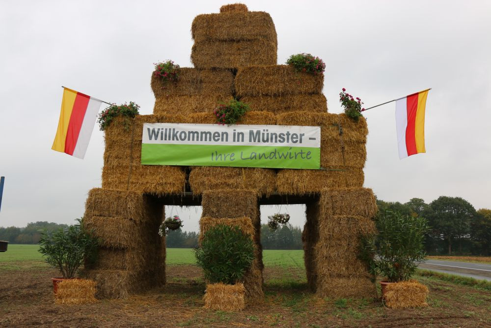 Münster <WLV> Wenn Münster am 3. Oktober mit dem Sparkassen Münsterland Giro wieder zur Hochburg des Radsports wird, sind auch die Münsteraner Landwirtinnen und Landwirte traditionell zur Stelle: Für die Zieleinfahrt in Münster, die über die Sprakeler Straße erfolgt, haben die hiesigen Landwirtsfamilien erneut eine meterhohe Nachbildung des Münsteraner Rathauses aus Strohballen errichtet. Dabei wird die Fläche um das „zweite Münster-Rathaus“ während des Giros zu einem Treffpunkt für den gesamten Stadtteil.
