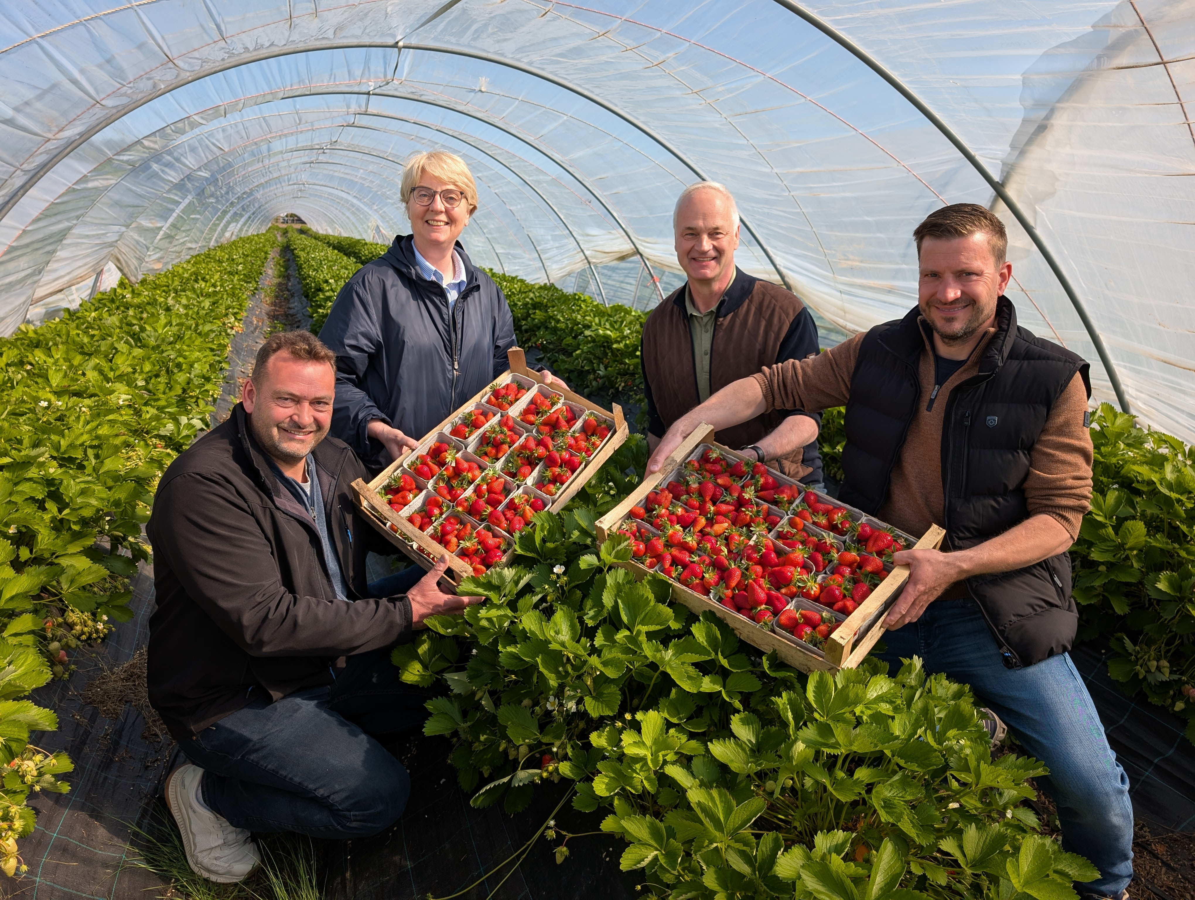 Münster <WLV> Endlich wieder Erdbeeren aus Münster! Die diesjährige Erdbeerernte startet in Münster dieser Tage – Verbraucher dürfen sich auf aromatische, saftige rote Früchte freuen. Der milde Winter und überwiegend günstige Witterungsbedingungen im Frühjahr haben für einen guten und frühen Start in die Saison gesorgt. Seit einigen Tagen ernten die Münsteraner Erdbeerbauern Burkhard Lütke Laxen, Stephan Bäcker und Wilhelm Spielbrink die ersten reifen Früchte auf ihren Feldern. Die Pflanzen haben sich gut entwickelt, sodass sich die Erzeuger über sehr gute Qualitäten und bereits zufriedenstellende Erträge freuen. Im Rahmen eines Pressegesprächs auf dem Betrieb Lütke Laxen gaben die drei Erdbeerbauern nun den offiziellen Startschuss für die diesjährige Erdbeerernte in Münster.